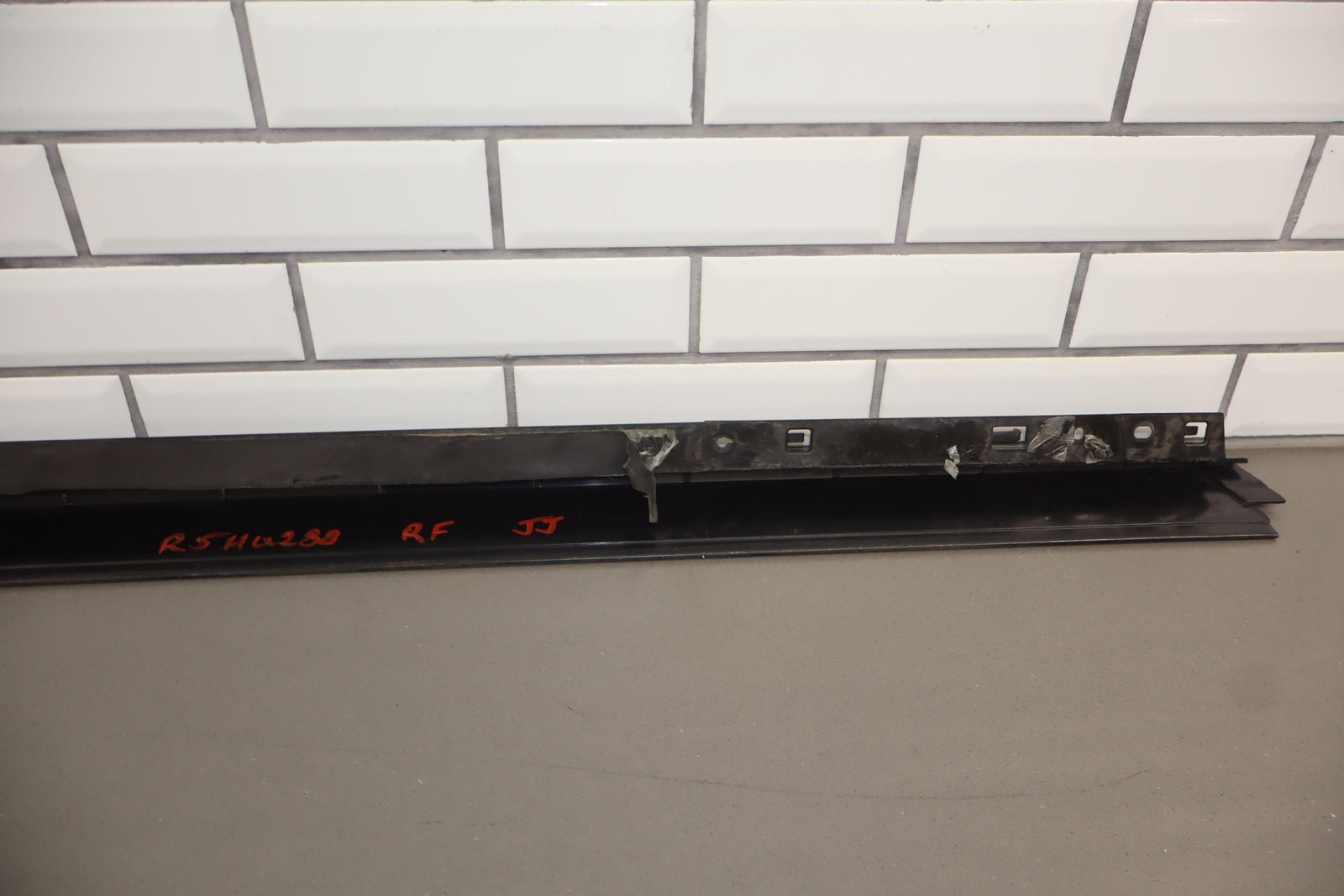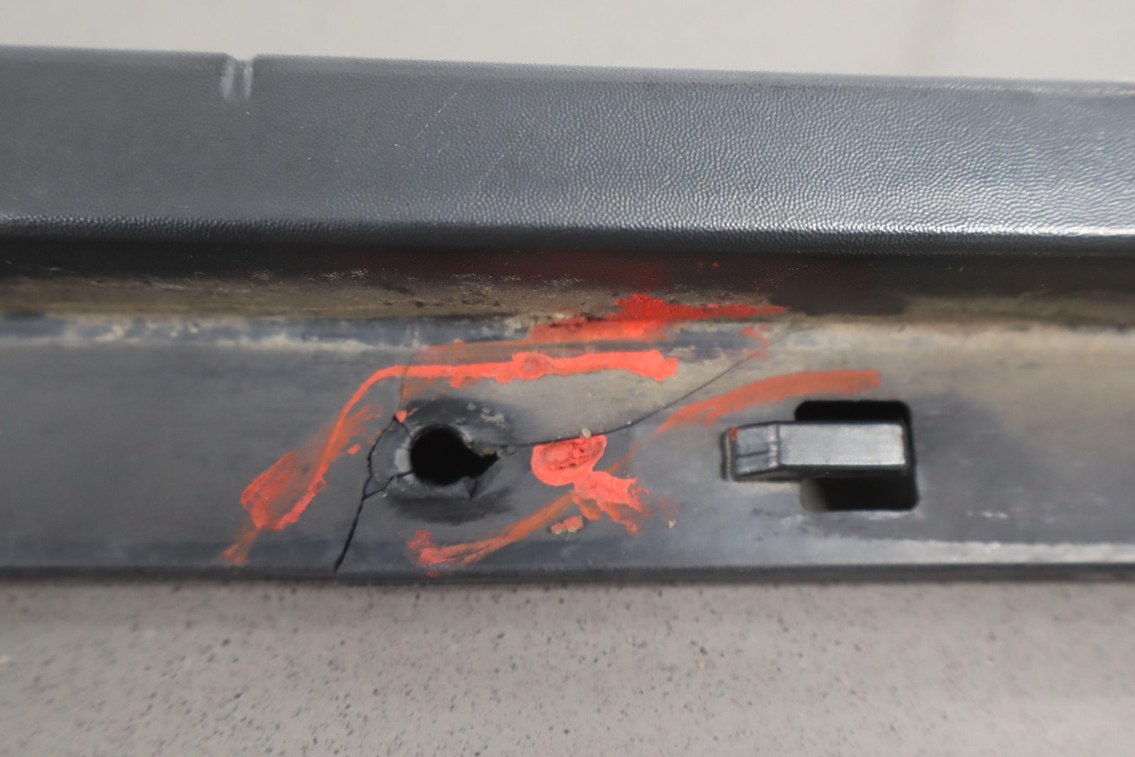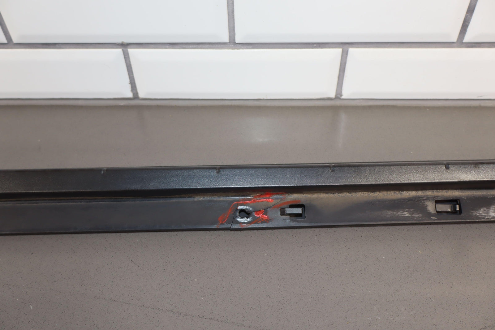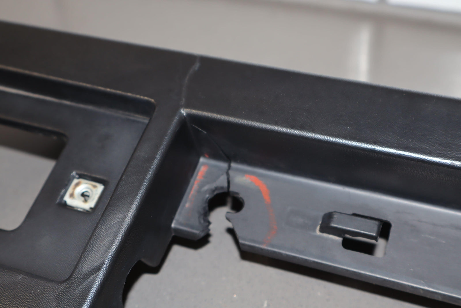 Rh Front Roof Moulding (windshield To Rear Door), Black Textured Plastic, Multiple Cracked Mounts (marked Red), Mild Sun Fade