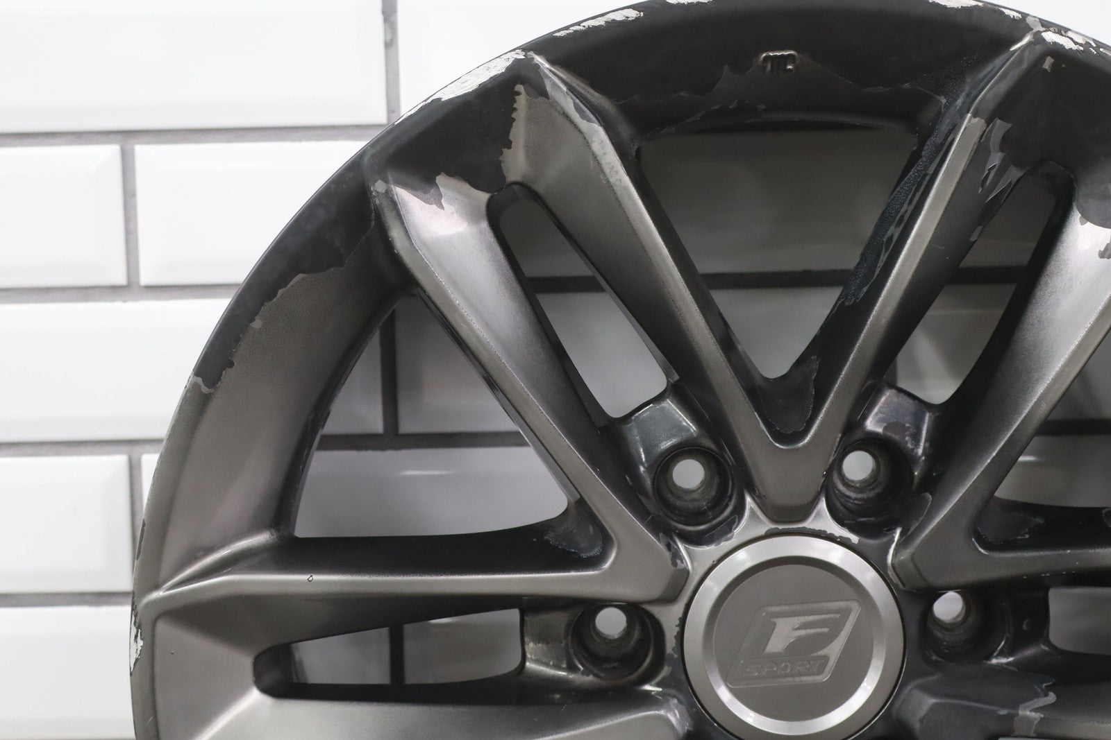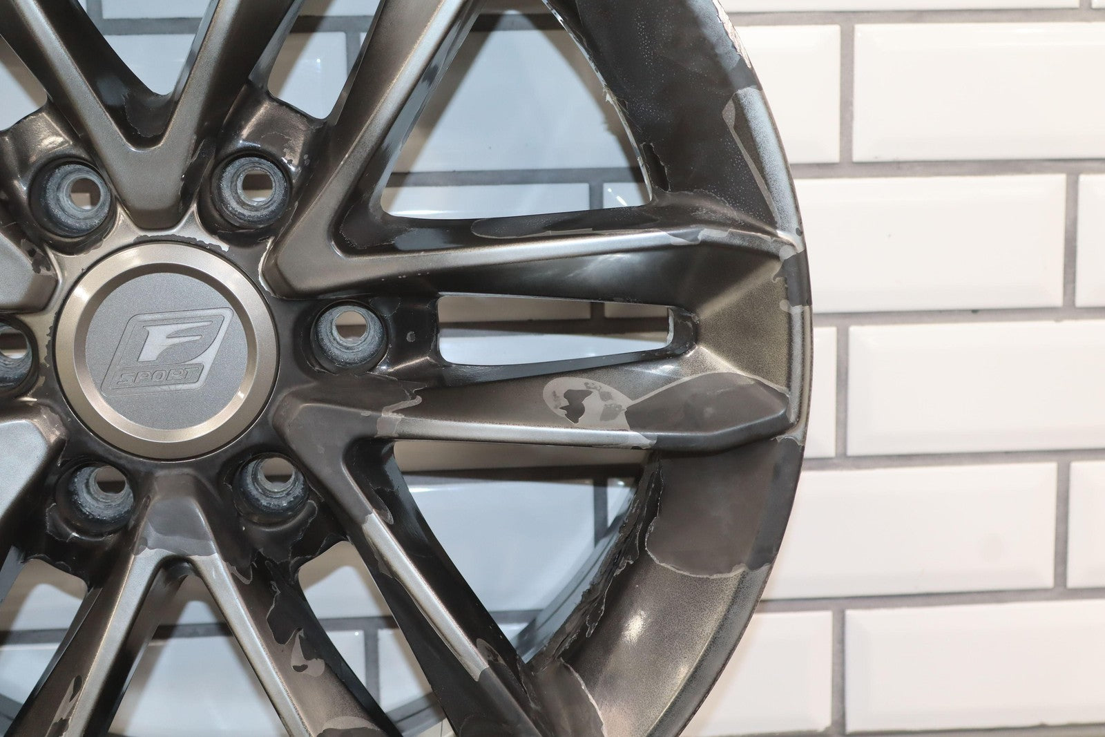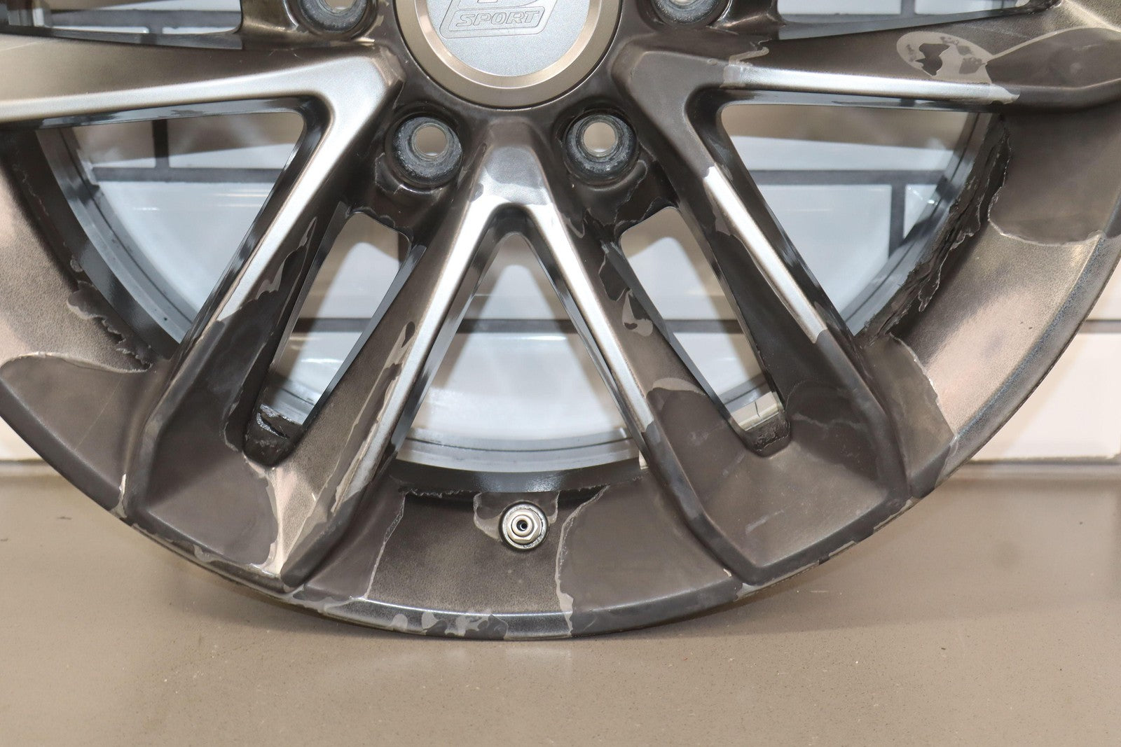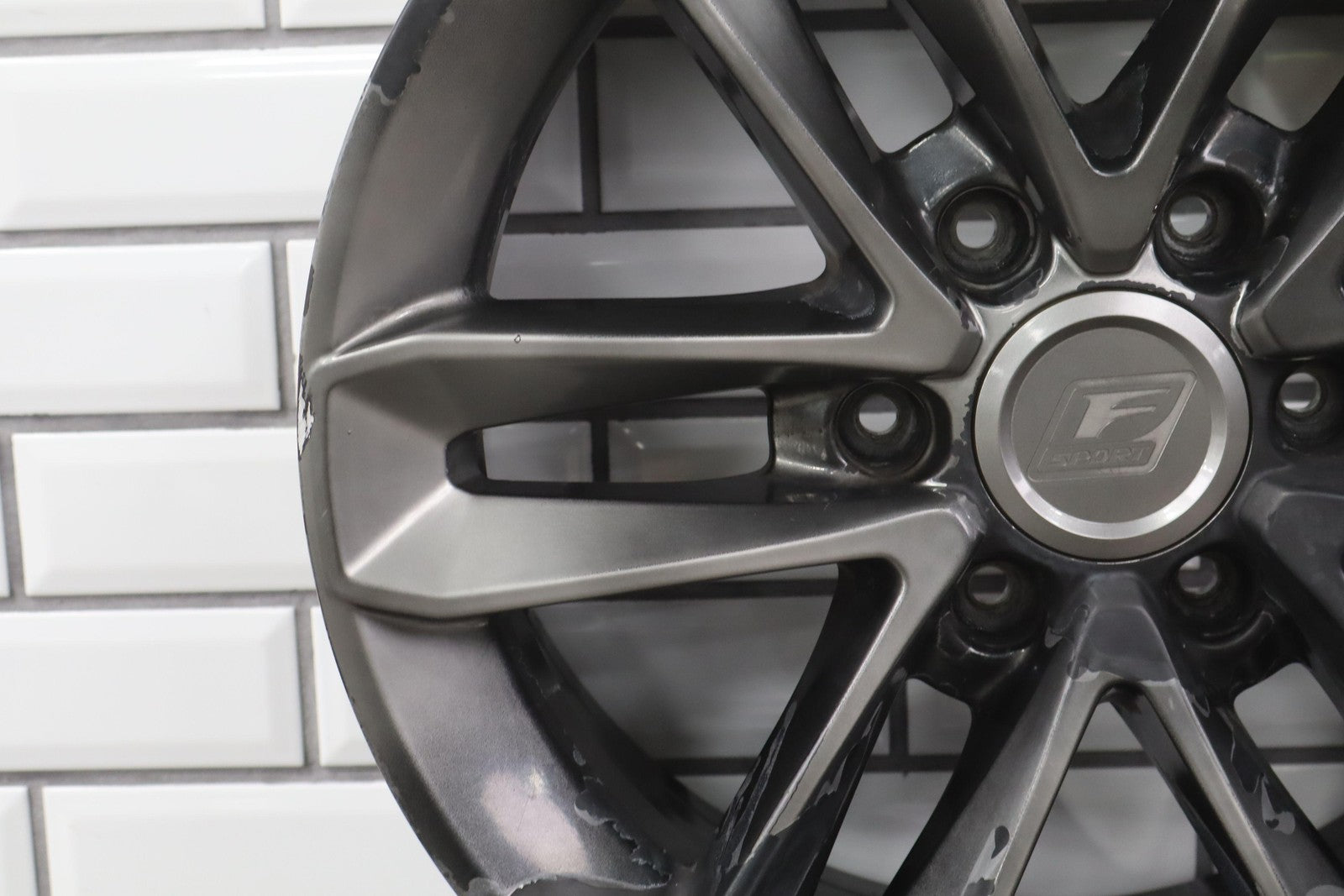 Lh Rear, 18x7.5 Split 6 Spoke Wheel, Gunmetal, Some Curb Rash, Heavy Finish Peel, Spun True