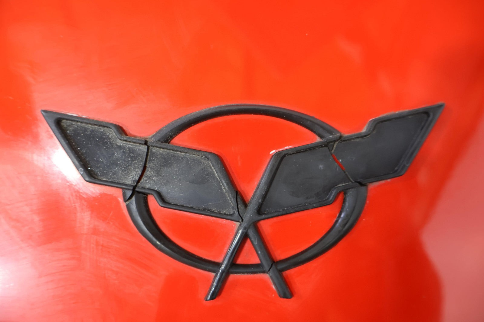 Fixed Roof Coupe (notchback), Torch Red (70u), Damaged Emblem, Light Scuffs/scratches, Mounted Solid